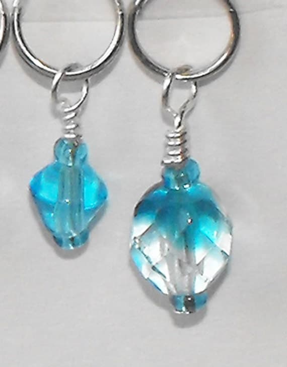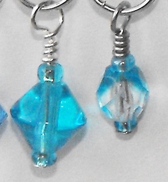 Accompanying markers consists of 1 marker with a 6mm bicone aqua blue glass bead with coordinating seed beads, 1 marker with a 8mm bicone aqua blue glass bead with coordinating seed beads, 1 marker with a 6mm rounded Firepol Crystal aqua blue bead with coordinating seed beads, and 1 marker with a 8mm rounded Firepol Crystal aqua blue bead with coordinating seed beads.