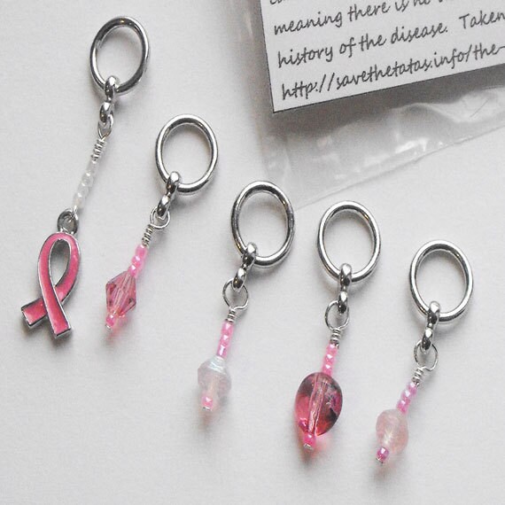 In case you missed our last post or don't have time to check out the video, our samples are titled Save the Ta-Tas. It is a set of 5 stitch markers in shades of pink and a pink ribbon charm to honor all the women who have been a victim of breast cancer. They are on sale now in the Two Sisters of Maine Etsy Shop.